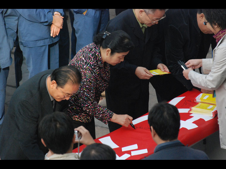 石景山 首钢工人在十进活动横幅上签字