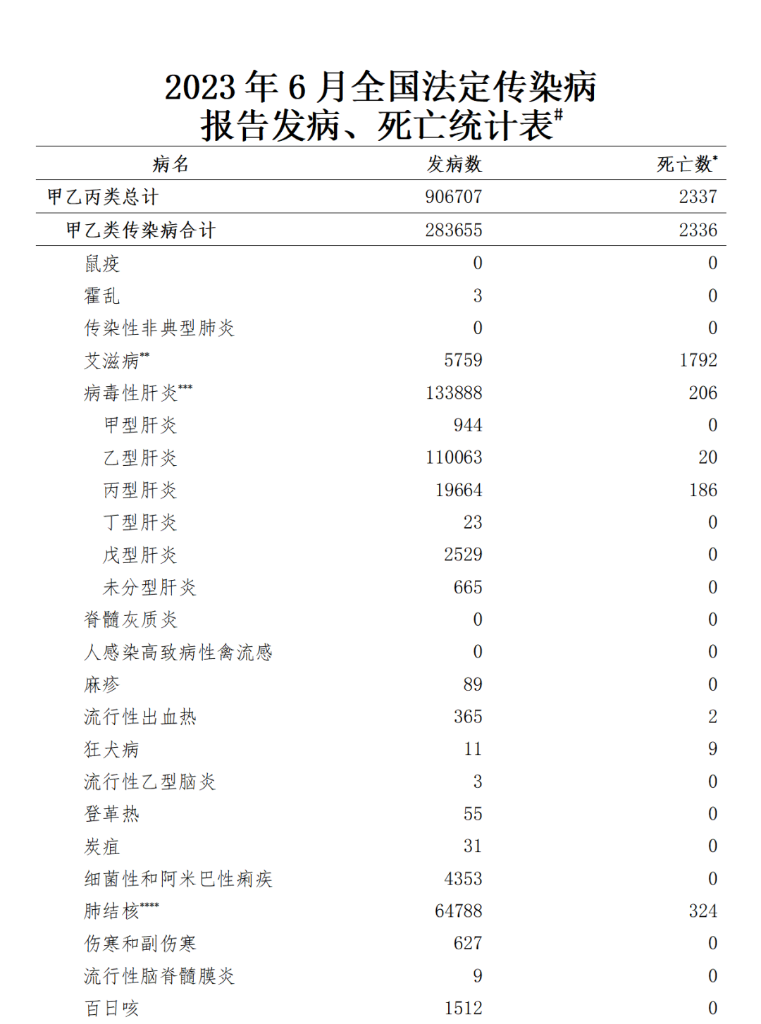 2023年6月(6月1日0时至6月30日24时),全国(不含香港、澳门特别行政区和台湾地区,下同)共报告法定传染病906707例、死亡2337人。甲类传染病报告发病3例,均为霍乱,无死亡病例报告。乙类传染病中,传染性非典型肺炎、脊髓灰质炎、人感染高致病性…