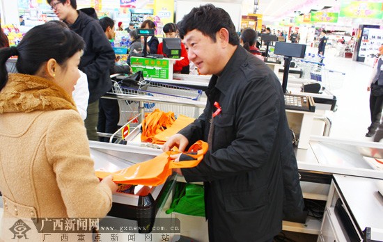 广西南城百货股份有限公司总经理陈玲在向消费者发放购物袋。