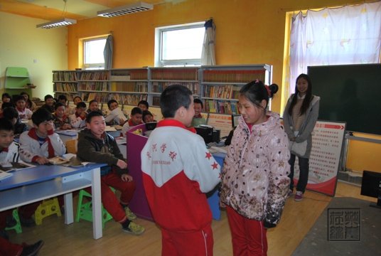 志愿者组织小学生互动游戏(杨彬/摄)