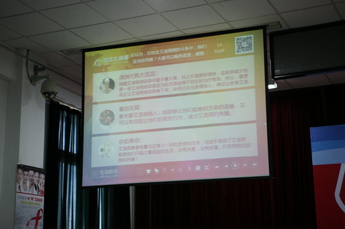 活动现场首次采取微信互动的形式,让大家更快、更直接交流和参与活动,获得艾滋病防治的更多信息。与会代表用不同的方式号召社会各界积极参与艾滋病防治工作。北京吉利大学、北京汇佳职业学校的学生防艾志愿者们通过朗诵、手语表演等形式,向大家传递防艾人人有责、防艾人人行动的理念,稻香村公司的志愿者代表发起“‘零’艾滋 我们在行动”的承诺,呼吁更多人加入到艾滋病防治志愿者行列中来,为抗击艾滋病作出贡献。