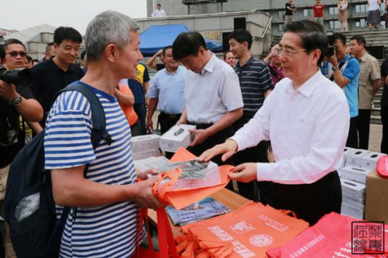 图为郭声琨向市民赠送禁毒宣传用品