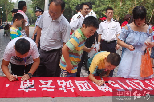 参加活动的领导、禁毒防艾志愿者及部分群众在横幅上签名