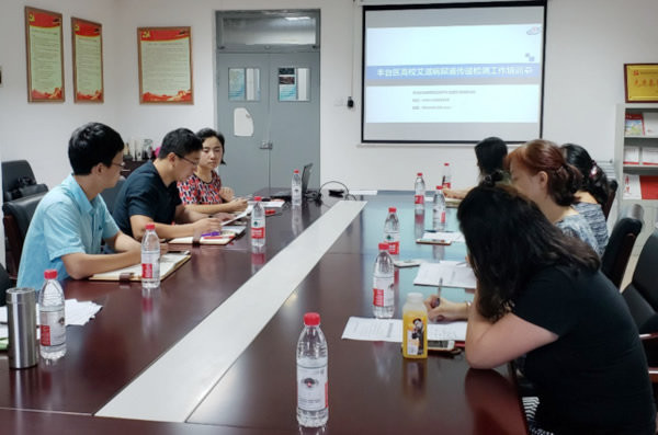 为了推进丰台区高校尿液检测HIV工作的顺利推进,进一步扩大HIV抗体检测的覆盖面,丰台区防治艾滋病委员会办公室于2018年7月19日上午,在丰台疾控中心第二教室组织召开了高校尿检工作推进会。丰台区卫生和计划生育委员会疾控科李若曦、丰台区疾控中心副主任谢彧洋、性病艾滋病防制科科长王欣心、首都医科大学、首都经济贸易大学、中国戏曲学院、北京电子科技学院的相关负责人及北京快易检创新技术有限公司运营总监蒋若冰及相关工作人员参加了本次会议。