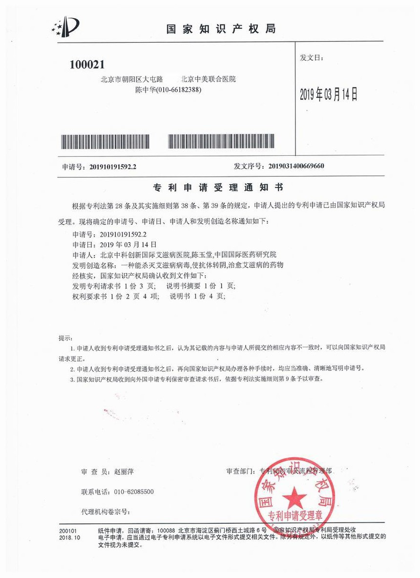 另外;北京中科创新国际艾滋病医院发明了一种能杀灭艾滋病病毒,使抗体转阴,治愈艾滋病的药物[艾滋1号],于2019年03月14日通过中国国家知识产权局申请发明专利。本发明涉及一种能杀灭艾滋病病毒,使抗体转阴,治愈艾滋病的药物[艾滋1号]为纯中药制成,具有治疗效果好,副作用小,疗程短等诸多优点;有增强人体自身免疫力,杀灭艾滋病病毒的功效,使HIV抗体转阴,能彻底治愈艾滋病的特点。