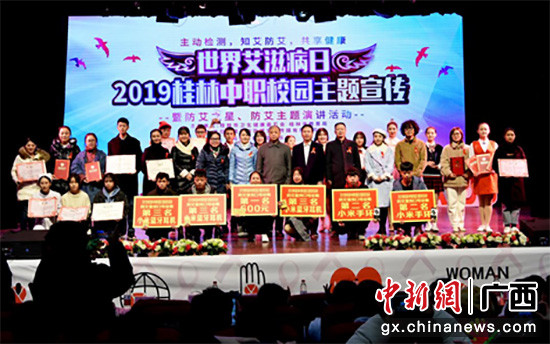 11月28日下午,由桂林市卫生健康委员会、桂林市教育局联合主办,桂林市各大中职学校支持举办的“预防艾滋 珍爱生命”——2019年桂林市中职校园防艾主题宣传大型活动暨防艾之星、防艾主题演讲比赛在桂林市群众艺术馆百花剧场举行。桂林市卫生健康委员会党组成员张朝阳、桂林市教育局副调研员张建生等有关领导出席活动并为获奖选手颁奖。