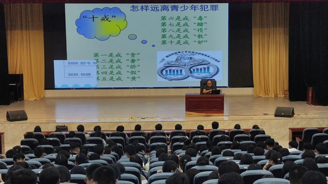 课堂上,王法官结合高中生身心特点,从校园生活实际出发,从什么是青少年犯罪、青少年犯罪的原因、青少年犯罪的危害和怎样远离青少年犯罪等方面,通过电子课件、互动问答等方式,用通俗易懂的语言、真实的青少年违法犯罪案例,以案说法、以事明理,呼吁同学们树立正确的世界观、人生观、价值观,做到“十戒”,争做一名遵守国家法律和学校规章制度的好学生。
