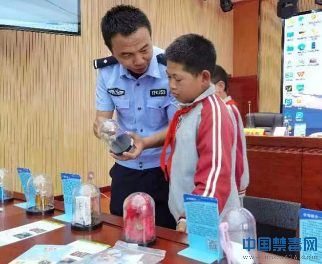 图为禁毒专干向学生展示毒品仿真模型。中国禁毒网发