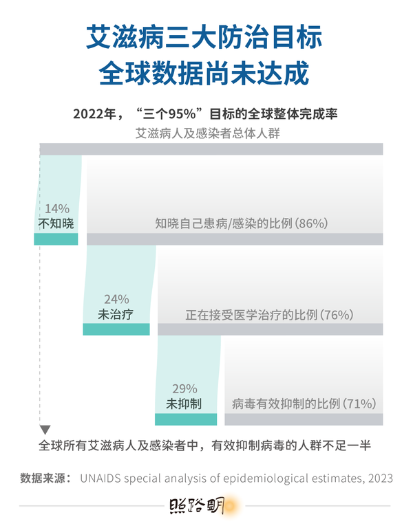 中国进展较好。2023年11月,国家卫生健康委副主任、国家疾病预防控制局局长王贺胜公开表示,中国艾滋病治疗成功比例已超95%。