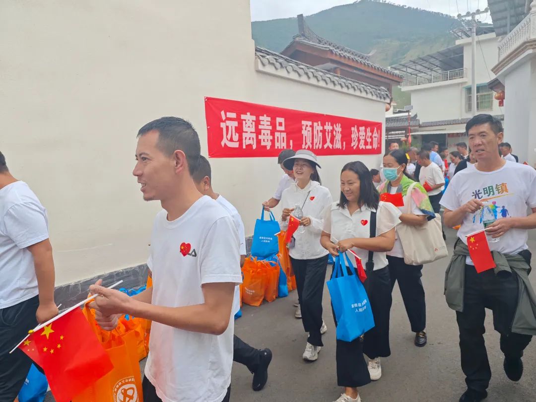 为进一步加强毒品、艾滋病预防宣传教育,增强全社会禁毒防艾、自觉抵制毒品的意识,营造全民健康浓厚氛围。2024年6月25日,“爱之家”喜德工作站以“6.26国际禁毒日”为契机,联合喜德县光明镇人民政府举办“2024年喜德县光明镇禁毒防艾徒步活动”。喜德县委副书记、光明镇党委书记包晓华,喜德县委常委、总工会主席邓阳和宣传部部长谭柏等县领导及光明镇干部职工、光明镇辖区内13个村6个社区群众代表参加徒步活动。