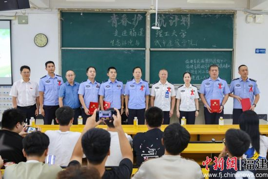 在普法课堂中,来自福建省闽江监狱的黄锦鑫通过情景模拟、数据解读和典型案例剖析等形式与同学们互动交流,系统阐释毒品与艾滋病传播的关联性,揭示新型毒品“伪装化”“零食化”的隐蔽危害,引导青年树立“防毒即防艾”的健康理念,帮助他们认清毒品的伪装特征、强化安全意识。福建理工大学城环学院党委副书记傅建清向黄锦鑫、黄建林、潘岳、李世杰等4位警官颁发了法治辅导员聘书。