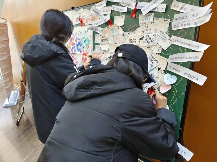 活动伊始,观众们走进“红丝带艺术长廊”参观防艾主题作品展,涵盖漫画、手绘海报、防艾油纸伞、瓷娃娃等多种原创作品,成为直观生动的“防艾教科书”。防艾志愿者现场发放防艾宣传单页、红丝带胸针,鼓励学生在便利贴上留下温暖话语,在防艾展板上许下美好祝福,让防艾宣传从“单向传递”升级为“情感共鸣”。