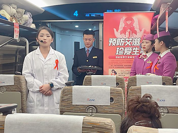 在第38个“世界艾滋病日”来临之际,近日,贵阳客运段联合贵阳疾病预防控制所(以下简称“贵阳疾控所”)在贵阳北开往南宁东的G3575次复兴号列车上开展了一场以“社会共治、守正创新、终结艾滋”为主题的移动课堂,将科学防艾理念传递给每一位乘客…