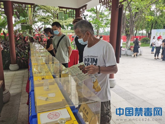 活动中,禁毒办工作人员通过展示禁毒相关图片、摆放仿真毒品模型的形式,向参展群众讲解毒品种类及其危害。