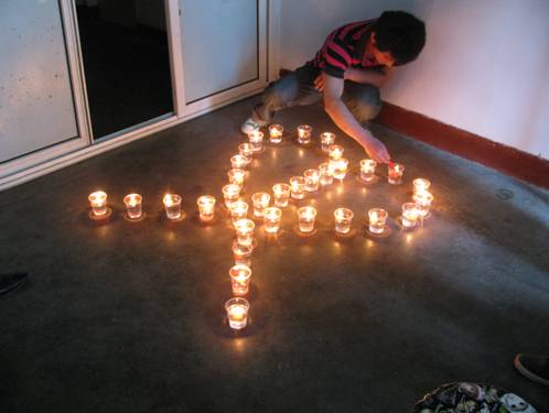 开展感染者互助工作的青岛爱心行工作组在5月16日举办了志愿者培训,当地市、区疾控、传染病院部分医生和10多名感染者一起参加了交流培训。当夜幕降临,大家一起点燃红蜡烛,红蜡烛外面摆成一个29根蜡烛组成的心形图案??这也是工作组的标识,里面是一个红丝带图案,总计54根蜡烛。29根蜡烛代表今年是人类与艾滋病斗争的第29年,而工作组共计54人则用蜡烛的总数表示。在温暖的烛光和2010年烛光纪念日主题曲《日子》的音乐声中,大家一起表达对逝者的追思和对未来生活的信心和祝福,烛光点点、泪光闪闪。