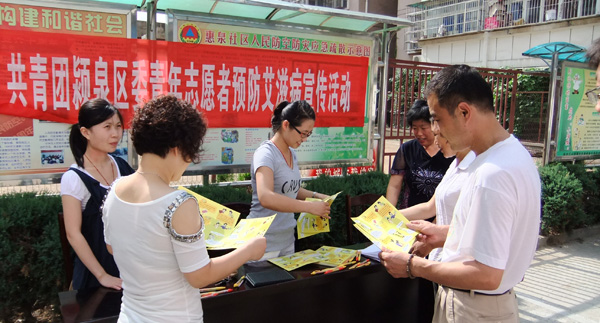 近日,团颍泉区委组织防治艾滋病青年志愿者到中市办事处惠泉社区进行防治艾滋病青年志愿者宣传活动。
