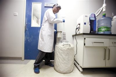 工作人员戴上防护面罩,从液态氮罐中取实验细胞株。