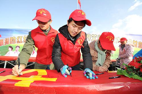 12月1日,银川市的志愿者在关爱艾滋病人的宣传带上签名。当日,宁夏回族自治区卫生、医疗部门联合行动,举行“世界艾滋病日”宣传活动,通过为市民免费检测、发放预防艾滋病手册和主题签名等活动让广大市民了解艾滋病,关爱艾滋病病人。新华社记着 彭昭之 摄