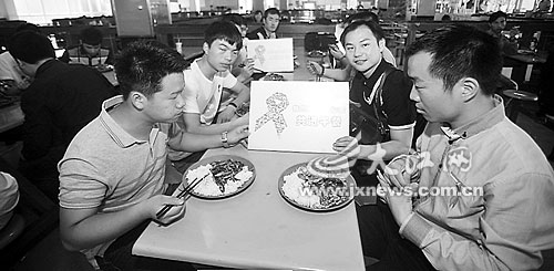 当天上午,在第一食堂的广场上,志愿者们用红丝带传递关爱,同学们则纷纷写下祝愿。中午,艾防专家、艾滋病感染者、志愿者和同学们一块在第一食堂共进午餐。