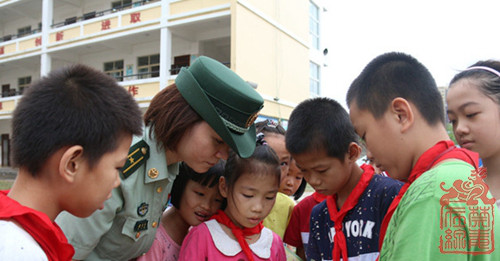 图为边检官兵为驻地学生讲解“禁毒防艾”知识