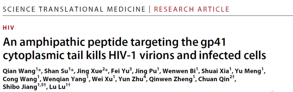 针对以上问题,复旦大学陆路/姜世勃团队联合中国医学科学院秦川团队于2020年6月3日在Science Translational Medicine上发表题为:An amphipathic peptide targeting the gp41cytoplasmic tail kills HIV-1 virions and infected cells 的论文,筛选得到了针对新靶点的抗HIV多肽。