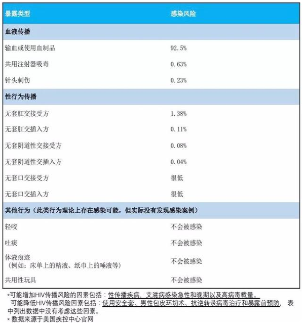 最后,再给大家展示一份单次暴露行为可能造成的HIV感染概率,仅供参考。要记得,概率始终是概率,对每个人来说,每次高危暴露的风险只有0%和100%的区别。