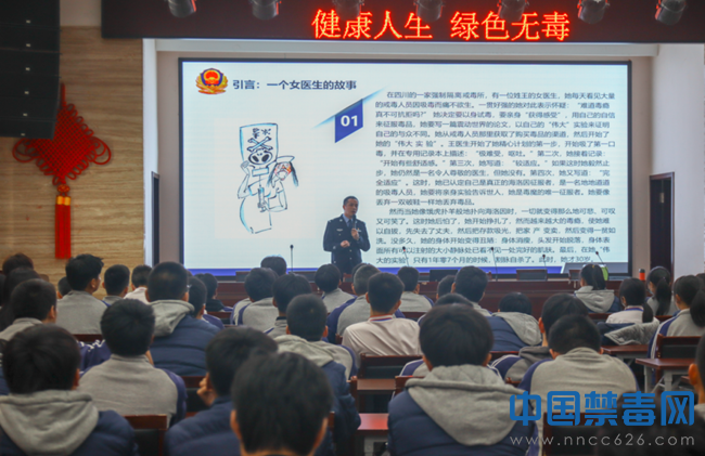民警以一个戒毒所女医生的故事开场,从毒品种类、毒品的危害与预防、树立健康观念和全国统一的司法行政戒毒模式等多个方面进行阐述,对毒品危害和防范等常识作了详细的讲解。同时,民警告诫学生要认清毒品危害,树立自我保护意识,避免因盲目好奇而遭受引诱,谨慎交友,自觉抵制不良诱惑,树立正确的人生观和价值观。