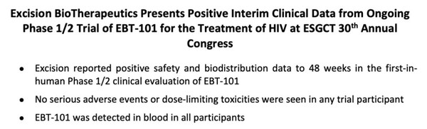 2023年10月25日,Excision BioTherapeutics在第30届欧洲基因与细胞治疗学会(ESGCT)年会上上介绍了正在进行EBT-101治疗艾滋病的1/2期临床试验的积极中期数据。