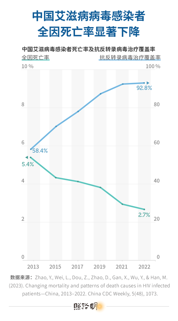 1980年代,艾滋病的确被视为致命疾病。但近十年,新增患病人数与死亡率均有明显下降。根据中国疾控中心统计,2013年到2022年,中国艾滋病患者的全因死亡率从5.4%降至2.7%。