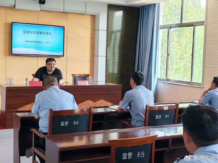 青州市疾控工作人员走近监室就艾滋病和结核病基本概念、传播途径、病理情况、流行的社会危害性、对人体的维护以及如何预防、控制措施等相关知识,用通俗易懂的语言向羁押人员讲解,并告诫他们要洁身自爱,远离毒品,加强身体锻炼,养成良好的生活卫生习惯,增强羁押人员健康意识,并为羁押人员解答相关疑问。